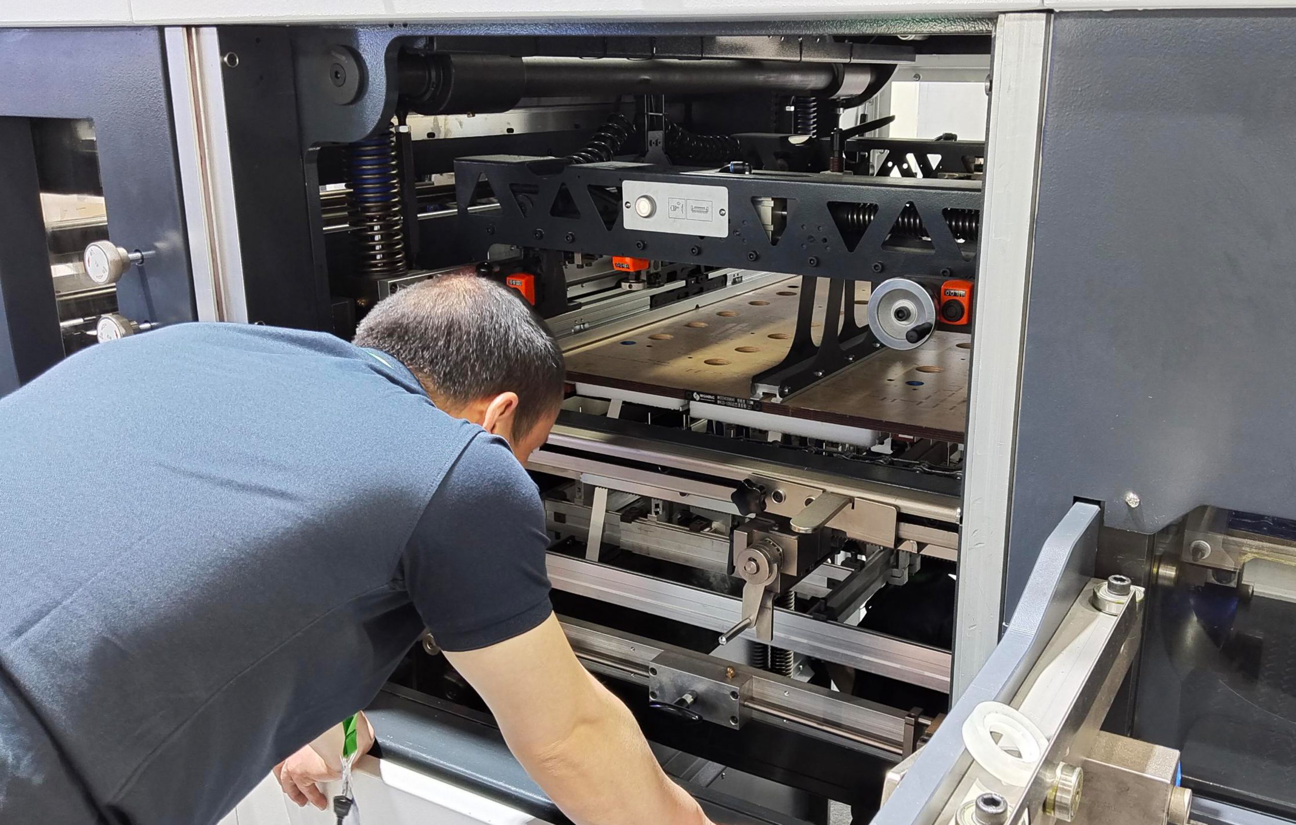 搭載四吸六送飛達和超聲波雙張檢測,避免雙張、卡紙等問題。模切部運用渦輪變速傳動技術(shù),動平臺精準運行變速,有效減少連點瑕疵,提升模切質(zhì)量。配備快速微調(diào)板框與微調(diào)下底板,使調(diào)板時間直接縮短50%。牙排采用靈活耐用的小叼嘴碳纖維材料。清廢部搭載三框四邊清廢系統(tǒng),防止散板現(xiàn)象。收紙部采用不停機卷簾副收紙設(shè)計,實現(xiàn)不停機連續(xù)收紙。