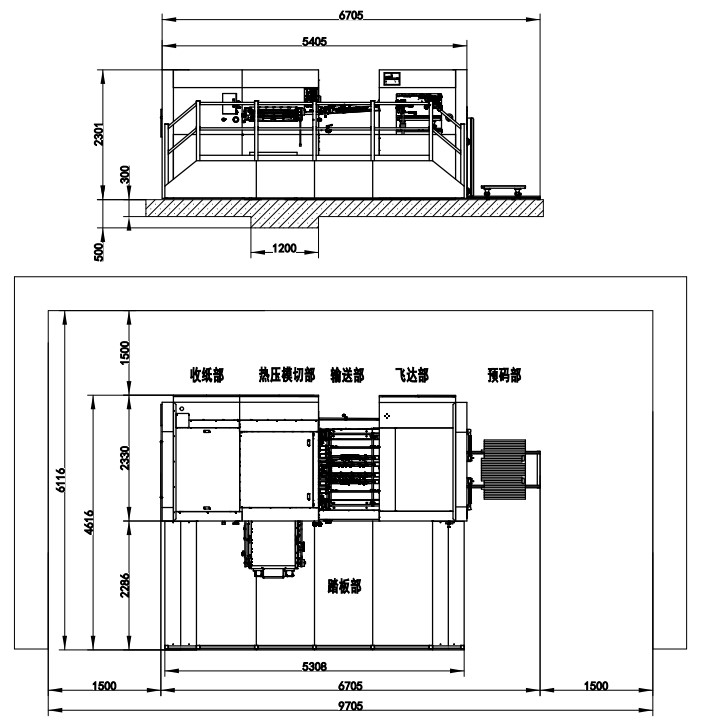 | 整機(jī)尺寸 | 6705×4616×2301mm(長(zhǎng)含預(yù)上紙軌道;寬含腳踏板) |